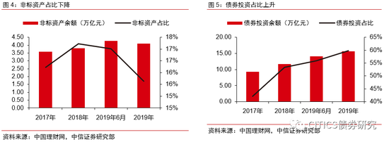观察资管新规整改的另一个重要角度便是非标资产的压降程度。根据2017年以来的各期《中国银行业理财市场报告》,我们统计穿透后的非保本理财产品实际持有非标资产的规模和占比,发现在资管新规发布后由于非保本理财存续规模上升,导致对应配置的非标资产规模也在增加,但是占比持续降低,并在2019年下半年实现了规模在绝对数值上的下降。2019年底非保本理财产品持有资产余额26.24万亿元,投资债券资产占比59.72%,同比上升6.37个百分点,投资非标债权资产占比15.63%,同比下降1.6个百分点,但如果按照《标准化债权类资产认定规则》口径计算,非标规模应还将扩大。