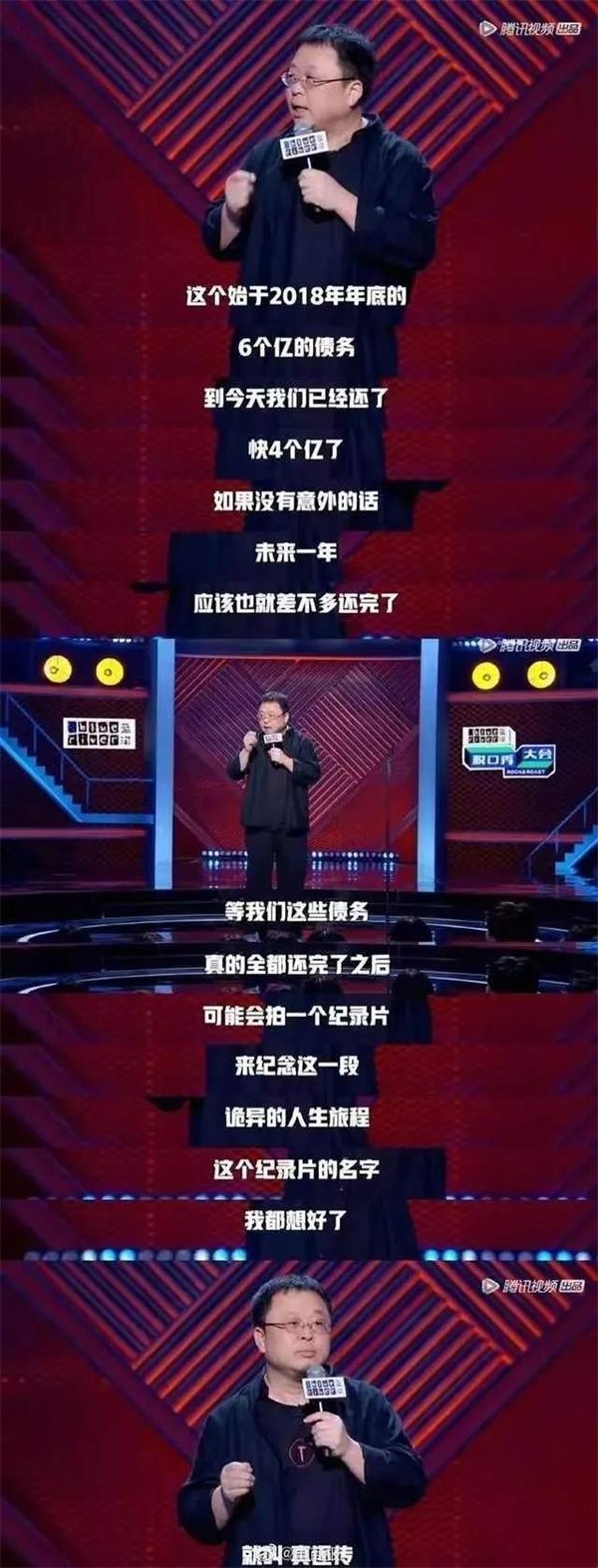 去年11月,被限制高消费的新闻传出后,人们才知道罗永浩原来背着6个亿的债款。在9月23日播出的《脱口秀大会》上,罗永浩不惧自嘲,并透露了自己已还4亿欠款。