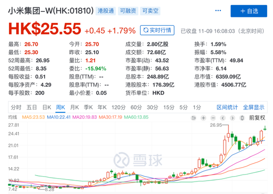 超出市场预期的业绩表现,也助推小米的股价不断创下新高,自去年9月初创下上市后最低价8.28港元,截至11月9日,小米集团股价累计涨幅达200%。而今年以来,小米集团累计涨幅也达137%。其总市值一度大涨3000亿港元并站上6000亿港元。