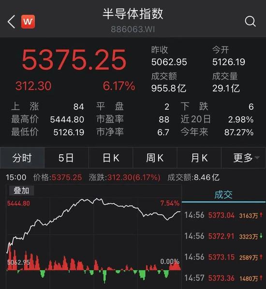 Wind半导体指数全天大涨6.17%,成交额955.8亿元。个股方面,芯原股份、捷捷微电、芯朋微等多只个股涨停。