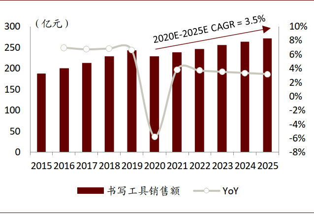 图表: 2020-2025E中国书写工具市场规模及增速