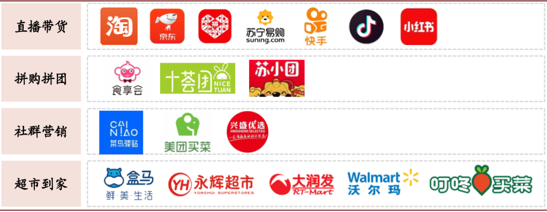 ► 新兴渠道、新模式供给快速增加:据Euromonitor数据,2019年超市相关行业的渠道结构中线上渠道占比已经高达24.3%,随着互联网电商、抖音和快手等公司持续加大零售行业投入,我们认为新零售渠道占比将持续提升,并带来直播带货、拼团拼购、社群营销等新模式兴起,对传统百货和专业连锁渠道带来冲击与分流。