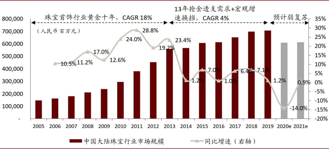图表: 中国大陆珠宝首饰行业市场规模及增速