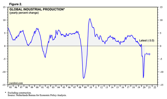 (作者注:根据下图10月23日Yardeni研究机构发布的数据显示,至8月全球工业生产水平距离疫情之前下滑了3%左右。)