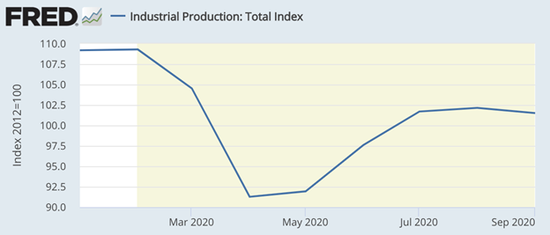 (作者注:根据下图美联储经济数据库10月16日发布的数据显示,9月美国工业生产水平距离疫情之前下滑了7.1%左右。)