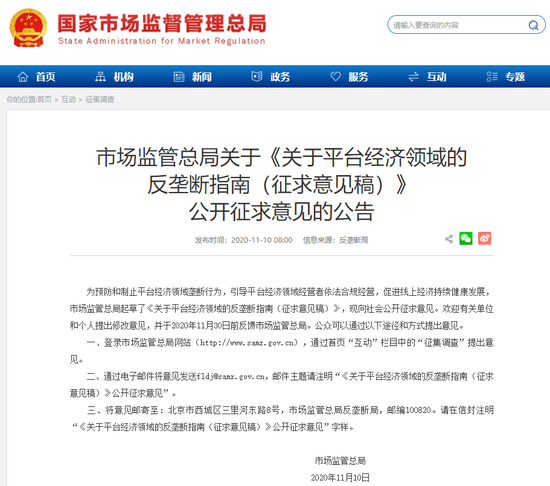 消息面上,市场监管总局11月10日就《关于平台经济领域的反垄断指南(征求意见稿)》公开征求意见。这标志着继汽车业、原料药领域,又一重点领域将有专门的反垄断指南即将出台。