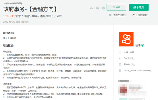 10月底,快手在招聘网站上发布了一则新的信息,开始招聘金融方向的政府事务工作人员。