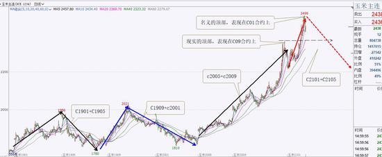 从玉米波动节奏看,玉米价格上涨遵循两个合约一个完整轮回,大体维持“上涨+下跌”节奏,无论从C1901+C1905、C1909+C2001都如此,2020年玉米上涨主浪在C2005+C2009两个合约已经完成,那么C2101+C2015大概率要走出上冲下行行情。