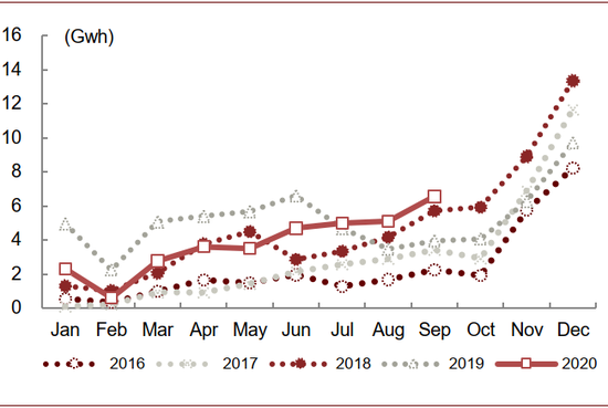 三季度以来国内锂电市场景气复苏。根据中汽协和GGII,1H20我国新能源汽车销量/动力电池装机量同比下降36%/42%。三季度以来行业景气复苏,7~9月我国新能源汽车销量同比增长23%/28%/73%,我国动力电池装机量同比增长6.0%/40.3%/65.8%,均逐月持续改善。我们认为2021年锂电行业将延续2H20复苏态势,下游企业盈利恢复将带动设备扩产需求。往前看,中金汽车组预计2021年我国新能源汽车销量为162万辆,同比增长约49%。