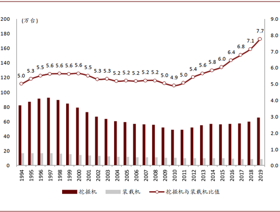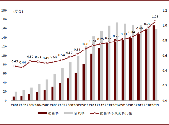 图表:中国挖掘机及装载机保有量比值提升至1:1