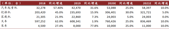 ► 汽车起重机及泵车:我们预计2021年同比双位数增长。1)低排放标准淘汰力度加大:当前存量混凝土泵车及汽车起重机以国三设备为主,根据工程机械协会数据,截至2018年底,我国属于国三标准及以下的存量设备占比高达61%。重型柴油车国六标准将明年7月针对所有车辆开始实施,带动国三以下标准更新加快。2)存量替换需求稳定:汽车起重机及泵车使用寿命约10年,在上一轮行业上升期销售的设备目前已经进入更新替换周期。以汽车起重机为例,假设9-11年前销售的产品分三年滚动更新,我们预计2020年汽车起重机更新替换需求约为30,000台,约占整体销量六成。整体上,我们预计2020年汽车起重机及泵车行业销量增速20%~30%,明年持续双位数增长。
