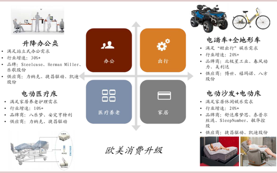 欧美消费升级符合未来社会发展趋势。过去20~30年,“物联网+电动化”在欧美地区催生了一系列的消费新业态,深刻改变了欧美人的办公、出行、医疗养老和家居的方式,诞生了如升降办公桌、电踏车、电动医疗床、全地形车等产品,这些消费产品的需求升级向上传导进而引发制造产业的结构升级,我们将这一趋势谓之“欧美消费升级”。