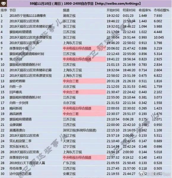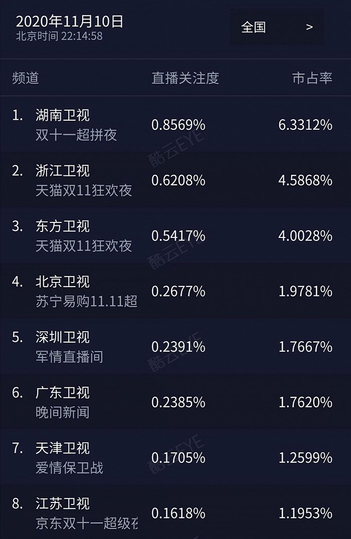 另外,从去年双十一晚会的竞争来看,去年打造苏宁易购嗨爆夜的湖南卫视,同样以微弱的优势,战胜了多年的天猫狂欢夜,这也验证了湖南卫视在直播晚会中占据有一定话语权。