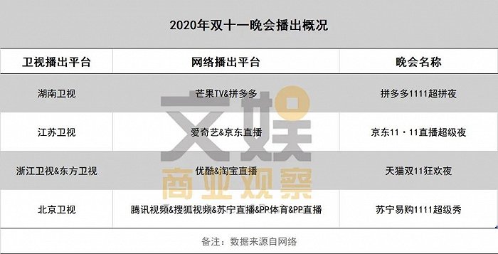 今年双十一晚会的架势,完全不属于历届的跨年和春晚,同时有四台晚会直播,无论是对于卫视平台还是视频网站,都实属罕见。