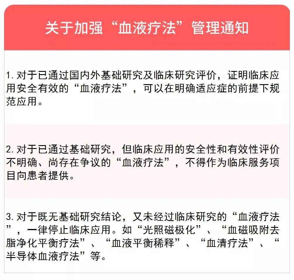 2005年,卫生部发布《加强“血液疗法”管理的通知》。当中提到,“血液净化”项目并非人人适用,而且在《医疗美容服务管理办法》规定的医疗服务项目中,也没有“血液治疗”这项内容。有需要的患者应谨遵医嘱,在正规医院接受治疗。