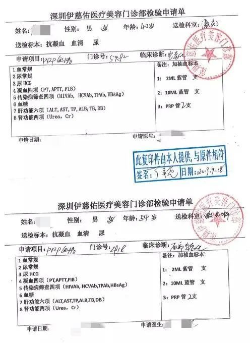 检查过程中,执法人员发现该门诊部的检验科存有患者姓名为詹某和郑某的“深圳伊慈佑医疗美容门诊部检验申请单”,两名患者申请单的申请项目为PRP血清,申请医生为王某。