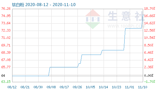据生意社,11月10日钛白粉商品指数为75.17,较前一日上升了2.37点,较周期内(2011-09-01至今)最高点100.00点(2011-09-04)下降了24.83%,较2015年12月29日最低点51.68点上涨了45.45%。