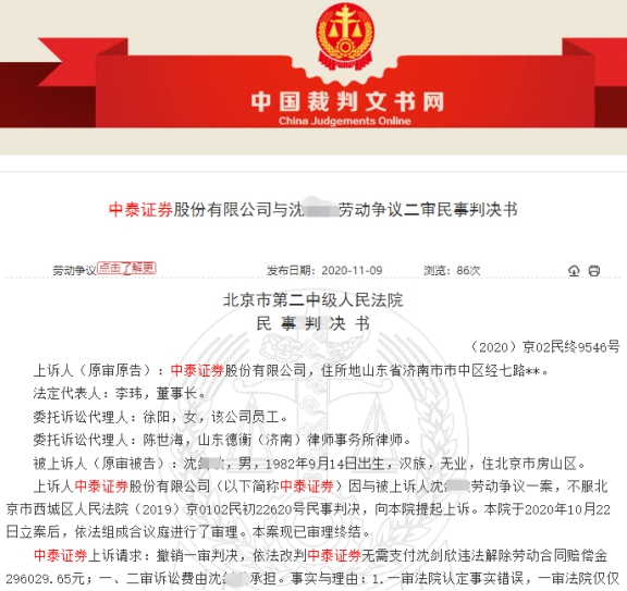 中国经济网北京11月11日讯(记者韩艺嘉马先震)近日,中国裁判文书网披露了中泰证券股份有限公司(简称“中泰证券”)卷入的一起劳动争议诉讼的二审民事判决书((2020)京02民终9546号)。这起诉讼以驳回中泰证券上诉,维持原判即支付违法解除劳动合同赔偿金29.60万元结案。