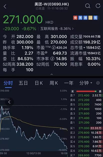 而美团在11月9日股价盘中高达338港元,总市值盘中一度超工商银行,现股价已跌回271港元,这两天一共跌去了近20%!