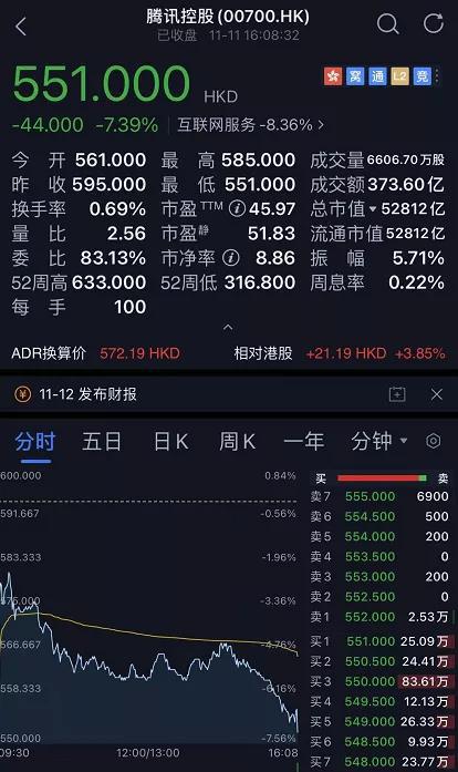 而腾讯在11月9日触及633港元的高位,现已回落至551港元,这两天跌去了11%。