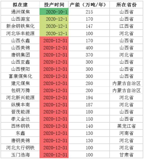 表1:2020年12月焦化新增产能计划投产4048万吨