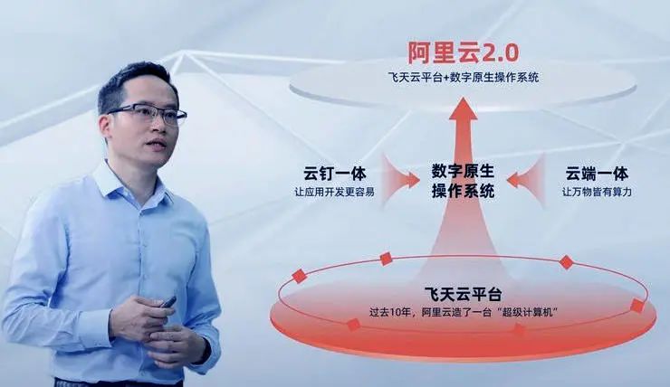 除去“商业”的范畴定性,也就是阿里云声称的1.0过渡到2.0,由简单狭义的“飞天”云平台,变成一个既有云、又有数字原生操作系统的一个复合型平台,而两翼则是“云钉一体”和“云端一体”的布局。