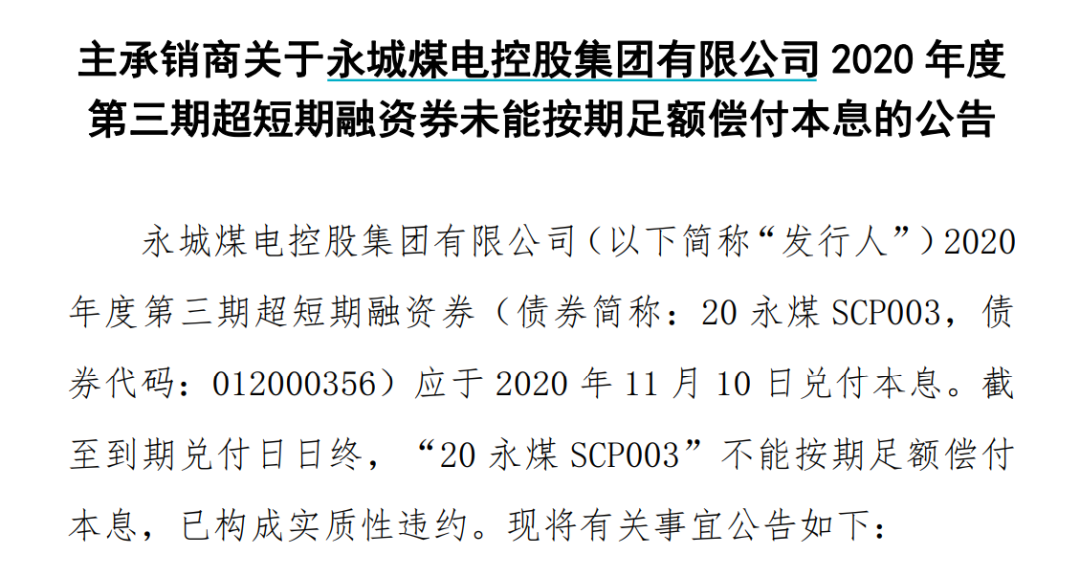 就在11月10日,永煤控股发布公告称,因流动资金紧张,“20永煤SCP003”未能按期足额偿付本息,已构成实质性违约,违约本息金额共计约10.32亿元。