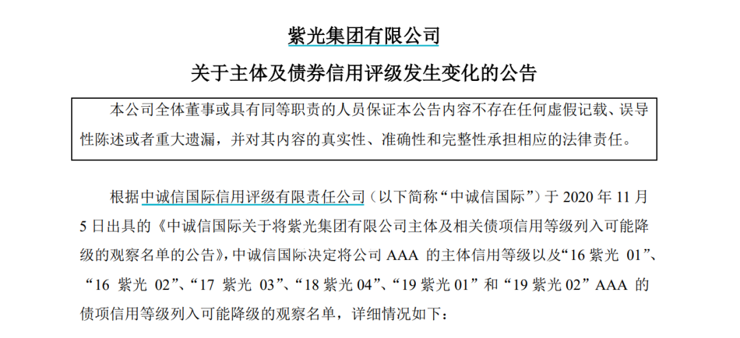 评级机构也下调了紫光集团及相应债券评级。11月5日,中诚信国际将紫光集团AAA的主体信用等级以及“16紫光01”、“16紫光02”、“17紫光03”、“18紫光04”、“19紫光01”和“19紫光02”AAA的债项信用等级列入可能降级的观察名单。