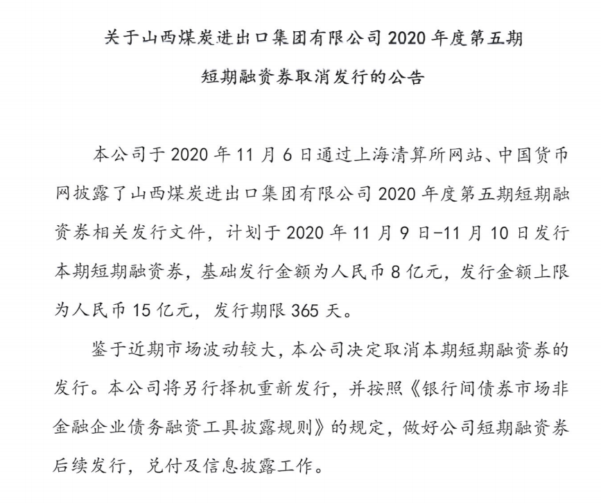 另外,山西煤炭进出口集团有限公司公告称,鉴于近期市场波动较大,公司决定取消发行“20山煤CP005”,将另行择机重新发行。