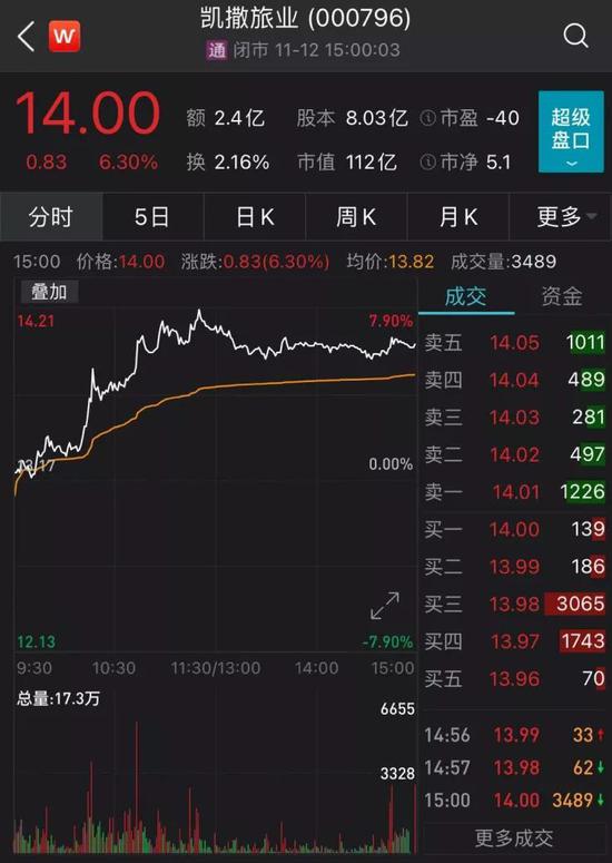 板块内,涨幅最高的是凯撒旅业,盘中一度快速上涨,曾5分钟内涨幅超过2%,全天高位震荡,最高涨幅7.90%。截至收盘,涨幅为6.30%,收报14.00元/股,换手率2.16%。