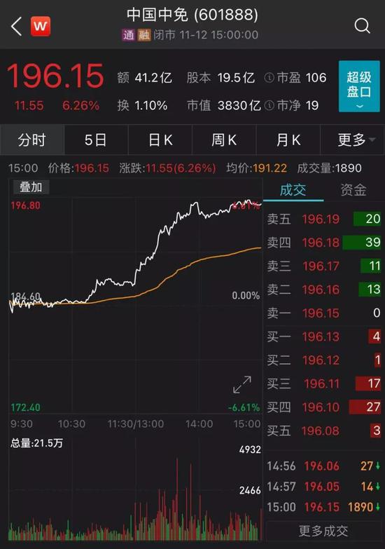 而另一免税龙头中国中免也是不甘示弱,同样大涨超6%以上,股价达到196.15元,市值为3830亿元。