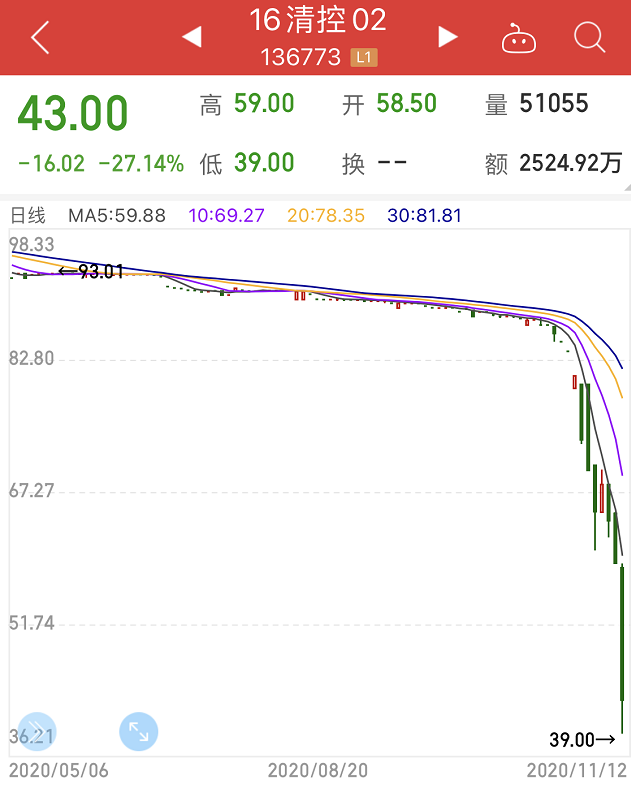 与此同时,清华控股公司债“16清控01”跌幅一度超10%,价格报53元,续创纪录新低。“16清控02”则出现放量大跌,跌幅一度超过30%,截至收盘价格为43元,跌27.14%。