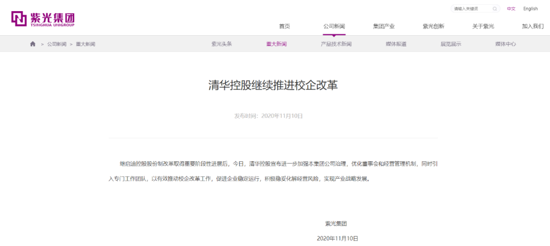 11月10日,紫光集团在官方网站表示,清华控股宣布进一步加强本集团公司治理,优化董事会和经营管理机制,同时引入专门工作团队,以有效推动校企改革工作,促进企业稳定运行,积极稳妥化解经营风险,实现产业战略发展。