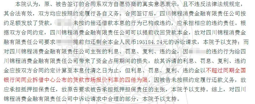 例如,10月12日,成都市郫都区法院发布了多则四川锦程消费金融与个人金融借款合同纠纷判决书,其中均提及利息、罚息、复利、违约金以不超过同期全国银行间同业拆借中心公布的贷款市场报价利率的4倍为限。