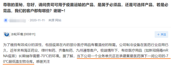 11月9日,辉瑞制药宣布,与BioNTech共同开发新冠mRNA疫苗能有效阻止90%的感染。复星医药复星医药则在此前获得了德国BioNTech SE授权,根据协议,双方将共同建立疫苗冷链体系,包括疫苗的储运和配送,以整体提升疫苗供应链服务。安信证券测算,明年该新冠mRNA疫苗有望为复星医药贡献16.87亿净利润,市值贡献337亿。但据报道,该疫苗的运输条件十分严格。