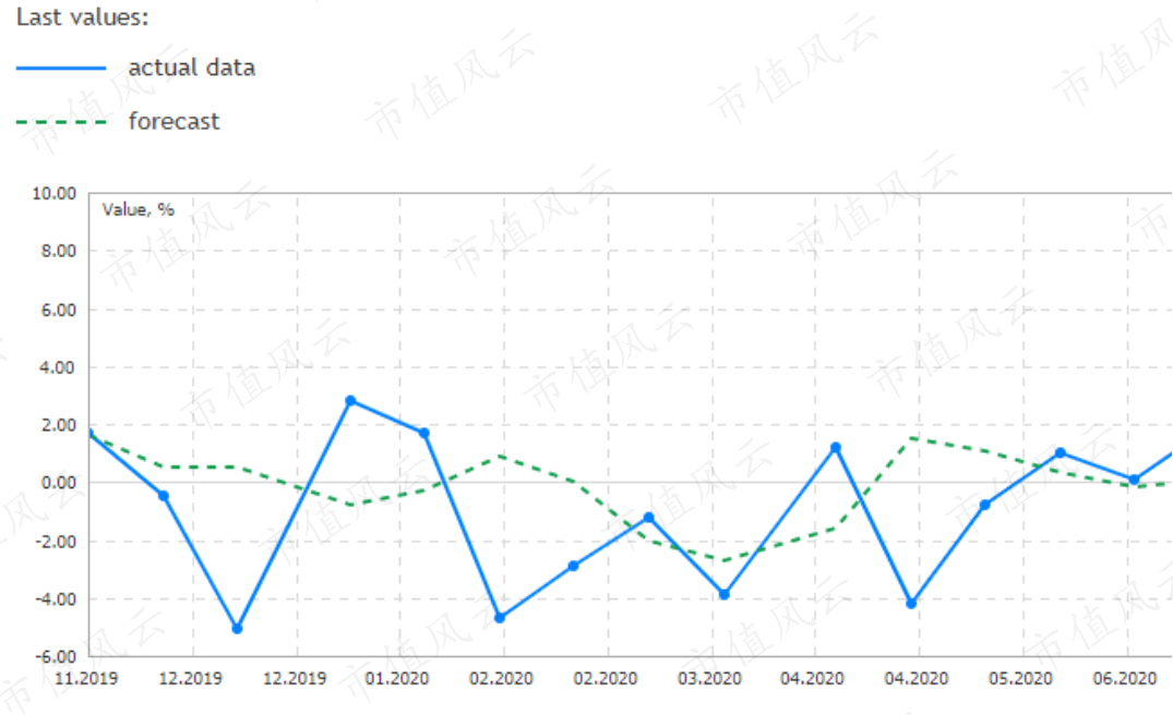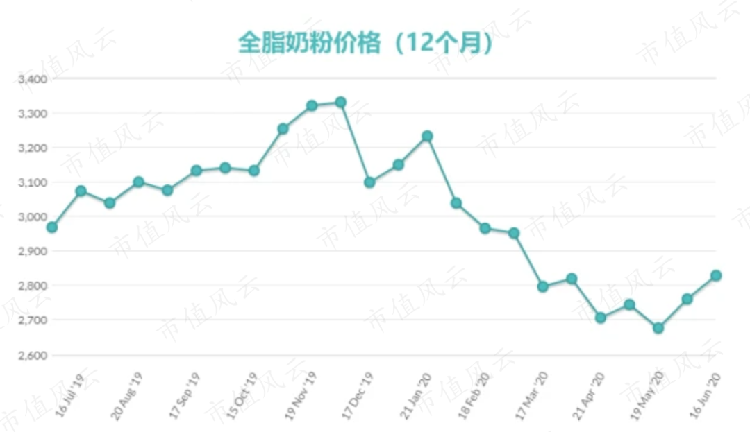 更加直观一点,也是非常具有指标意义的是新西兰全脂奶粉交易价格,如下图所示,全脂奶粉价格从2019年的11、12月份就开始了一波下跌,然后又从今年年初一路下跌至5月份。