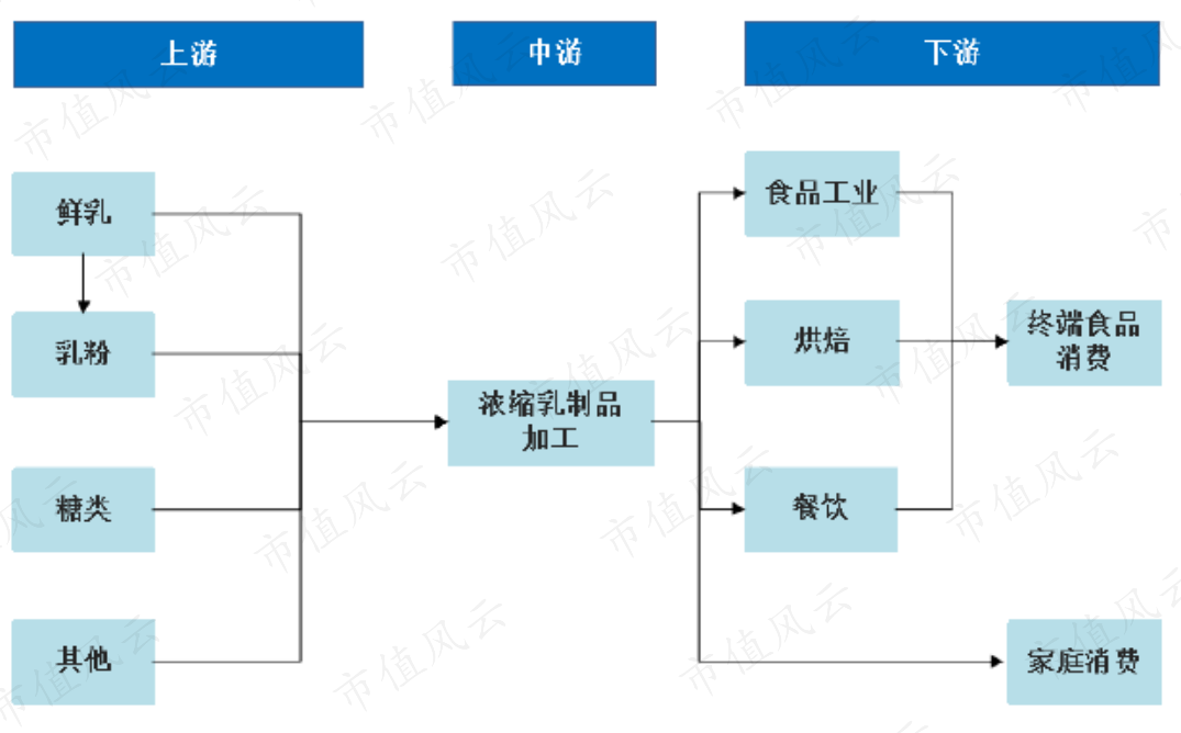 熊猫乳品主要做的是浓缩乳制品,浓缩乳制品的产业链结构如下图所示:上游行业是主要是鲜乳、奶粉和白砂糖行业,供应的是原材料;下游则分为To C端和To B端。