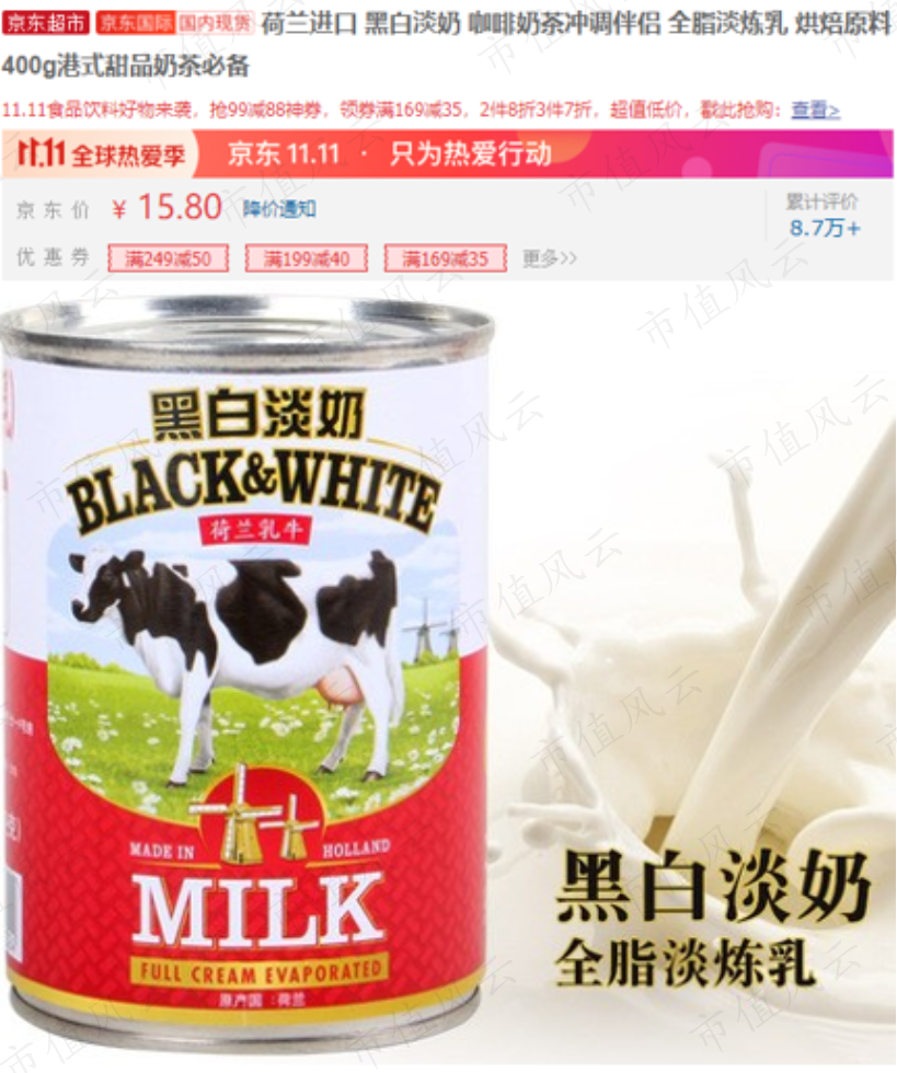 风云君在京东商城上找到了荷兰皇家菲仕兰的黑白牌淡奶,一罐黑白牌淡奶的净含量为400g,其价格为15.8,比熊猫乳品的同类产品差不多要贵25%-50%。