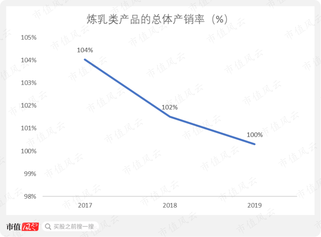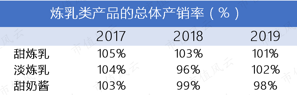 炼乳类产品的总体产销率,也从2017年的104%下滑至2019年的100%。