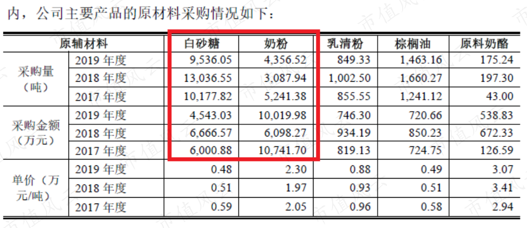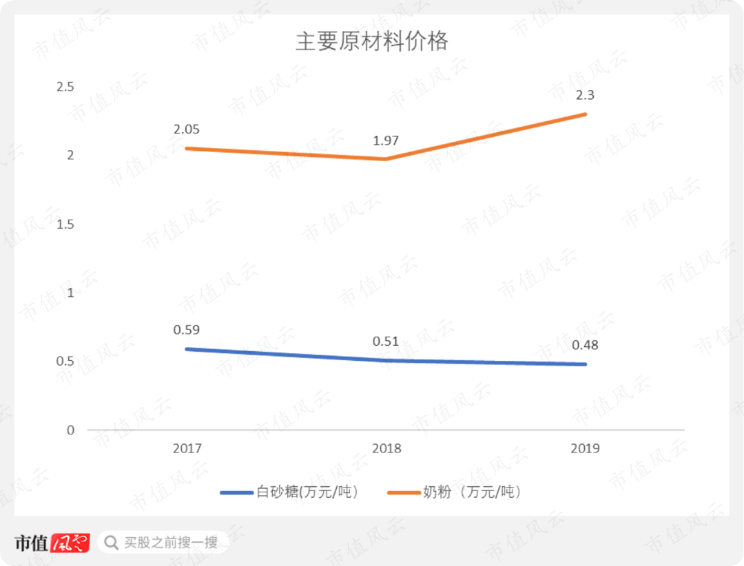 采购单价方面,白砂糖的采购单价从2017年的0.59万元/吨,下降至2019年的0.48万元/吨。奶粉的采购单价则先从2017年的2.05万元/吨,下降至1.97万元/吨,后又攀升至2.3万元/吨。