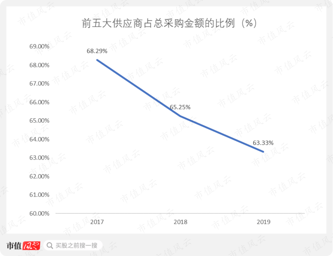 2017-2019年,前五大供应商占总采购金额的比例从68.29%下降至63.33%,比例虽然在下降,但是集中度依旧很高。