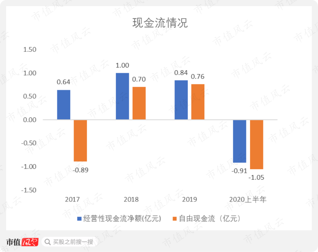 自由现金流和经营性现金流净额在2018、2019年都双双保持正值,但是到了今年上半年,二者又变为负值了。