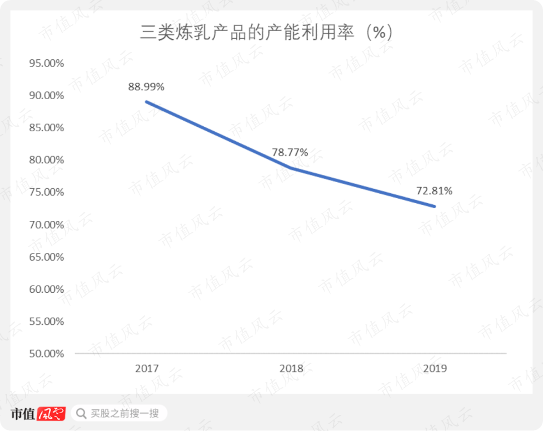 2017-2019年,三类炼乳产品,即甜炼乳、淡炼乳、甜奶酱,合计的产能利用率从88.99%下降至72.81%。(注:奶酪等其他产品的产销量比较低,所以这里不作分析。)