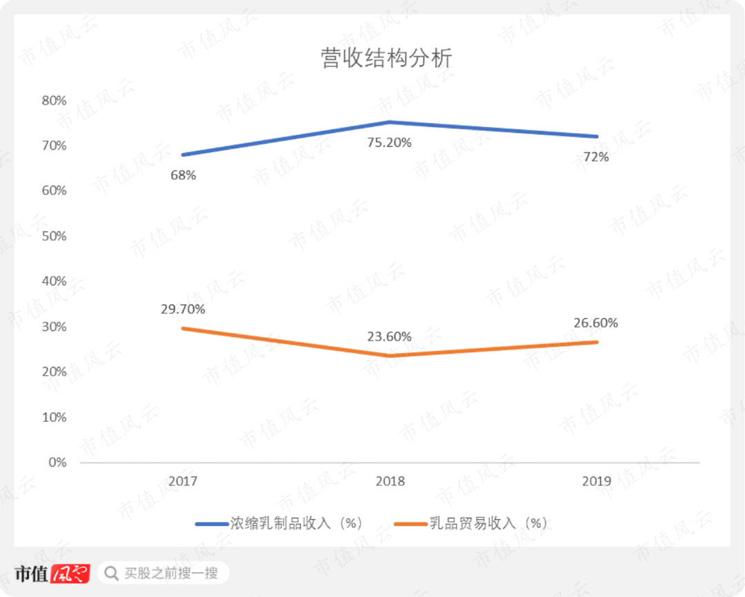 2017-2019年,熊猫乳品70%左右的营业收入都是来自浓缩乳制品,剩下的收入基本都是来自乳品贸易。乳品贸易业务主要是指公司从新西兰恒天然进口奶粉,然后在中国销售。