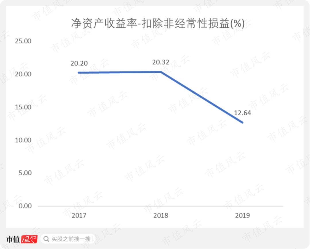 既然净利率变得这么差,自然,扣除非经常性损益之后的净资产收益率,在2018-2019年期间也遭遇了下滑。
