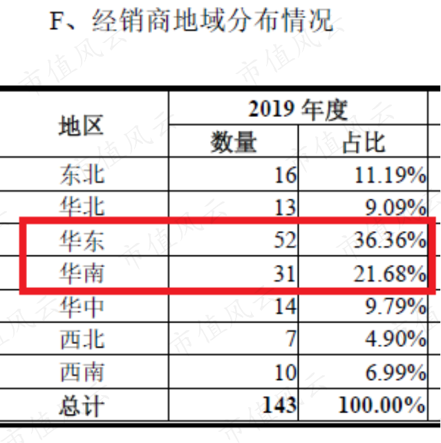 从地域分布来看,50%以上的经销商位于华东和华南区。