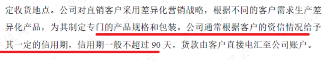 熊猫乳品对经销商统一采用款到发货的销售结算方式,赊销很少。但如果是直销模式,就不一样了,熊猫乳品会根据客户的资信状况,给予一定期限的信用期,信用期通常在3个月以内。