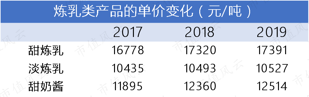 我们看到,从2017年开始,三种炼乳类产品的单价就一路上涨,其中,拳头产品甜炼乳的单价从2017年的1.68万元/吨上涨至2019年的1.74万元/吨。