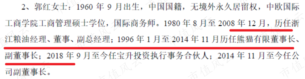 郭红目前是熊猫乳品的副董事长, 也是持股10%以上的大股东。其简历显示,郭红曾经是浙江粮油的董事和副总经理,后来又同时担任熊猫乳品这边的董事长,浙江粮油退出熊猫乳品之后,郭红便成为后者的副董事长。