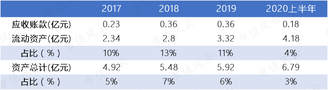 2017-2020年上半年,应收账款占流动资产的比例一直在15%以下,占总资产的比例也一直在10%以下。